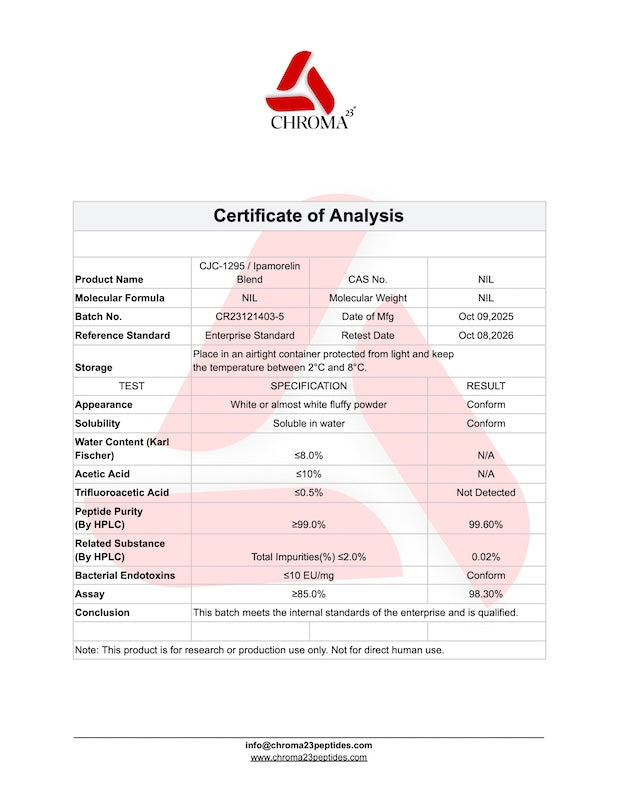 The CJC-1295 & Ipamorelin blend is a synergistic research formulation combining two well-known growth hormone secretagogues. This blend is designed for controlled studies focused on the mechanisms of growth hormone release, endocrine signaling, and peptide-receptor interactions. CJC-1295 is a synthetic analog of growth hormone-releasing hormone (GHRH), while Ipamorelin is a selective ghrelin receptor agonist. Together, these compounds have been widely studied for their ability to modulate endogenous hormone secretion in controlled in vitro and in vivo research models.