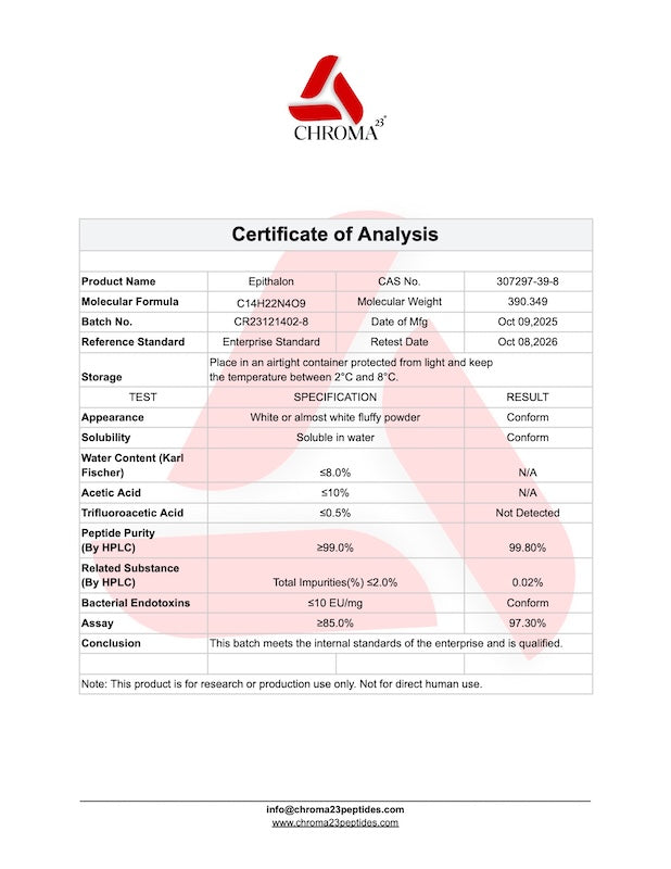 Epithalon, also known as Epitalon (Ala-Glu-Asp-Gly), is a pineal-derived synthetic peptide that has been the subject of extensive research in cellular aging, telomere science, and regulatory peptide biology. A seminal in vitro study demonstrated that Epithalon induces significant telomerase activity and telomere elongation in human somatic cells. Treated fibroblasts exhibited activation of the telomerase catalytic subunit and extended telomere length beyond the standard Hayflick limit, indicating potential for extended cellular lifespan (Alzheimer's Drug Discovery Foundation, Revolution Health & Wellness, Ingenta Connect, PubMed). Research in animal models and human cohorts has revealed that Epithalon may support pineal gland function and melatonin production, which frequently declines with age. In aged primates and elderly participants, treatment with this peptide was associated with normalized melatonin synthesis and improved circadian rhythm regulation (ResearchGate, PubMed). Additional studies have explored its antioxidant and immune-supportive effects. In aging oocyte models, Epithalon increased antioxidant enzyme activity (such as superoxide dismutase), reduced reactive oxygen species (ROS), and preserved cellular morphology, suggesting protective effects against oxidative stress in aging cells (Aging-US). Epithalon’s compact tetrapeptide structure and chemical stability make it well-suited for laboratory investigations across in vitro and in vivo systems, including research on DNA stability, immune aging, sleep modulation, and cellular senescence pathways.