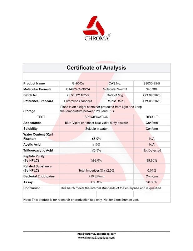 Because of its copper-binding properties, GHK-Cu also plays a role in antioxidant defense systems by modulating enzymatic activity involved in oxidative stress responses. Its high biocompatibility and multifunctional signaling roles make it a valuable tool in peptide research focused on dermatology, tissue repair, and cellular health.