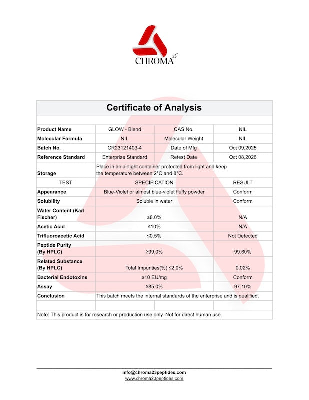 Glow Blend is a uniquely designed research peptide combination featuring three prominent peptides: GHK-Cu, BPC-157, and TB-500. This synergistic formulation is intended to provide researchers with a robust tool to explore complex biological processes related to skin regeneration, tissue healing, and cellular function regulation.