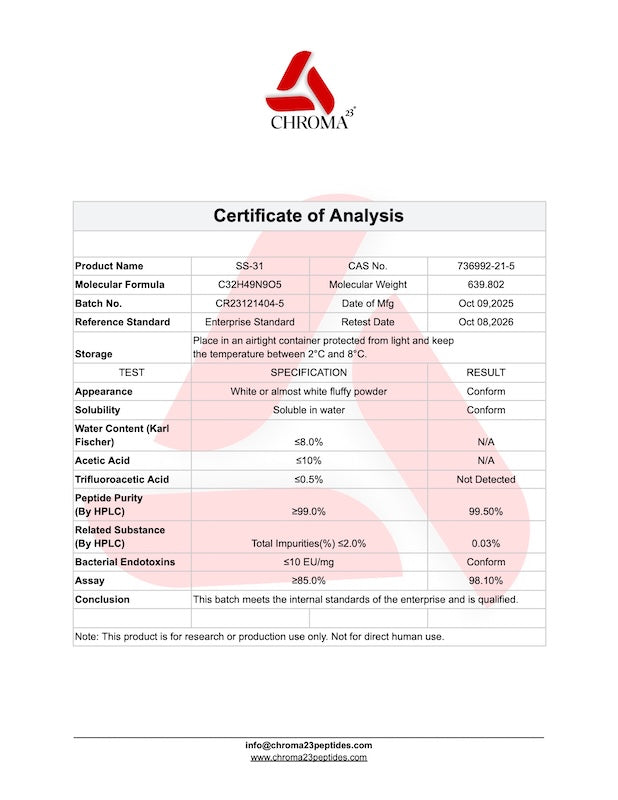 SS-31 is a mitochondria-targeting tetrapeptide widely studied for its role in supporting mitochondrial structure, bioenergetics, and cellular resilience. Research models suggest SS-31 selectively associates with cardiolipin in the inner mitochondrial membrane, a key phospholipid essential for efficient electron transport and ATP generation. By stabilizing cardiolipin–protein interactions, SS-31 is explored for its potential to enhance mitochondrial efficiency, reduce oxidative stress, and support cellular performance under metabolic or ischemic stress.